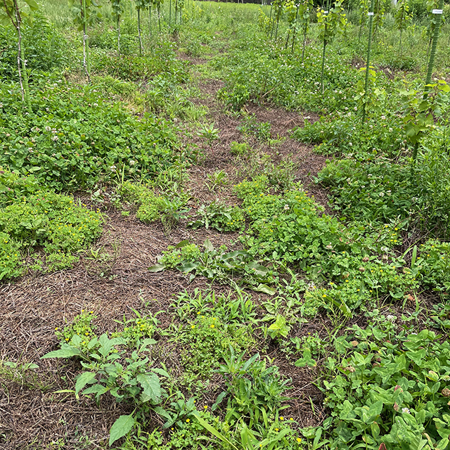 これがうまくいけば、害虫駆除の農薬散布を避けられる。そのためには丁寧に1本ずつ苗の様子と草たちの様子を見ることが必要だ。なんとも手がかかる。効率や費用対効果を重視する昨今の世の中の動きとは逆行するが、長期的に広い視野で考えると、そのほうがメリットがあると私は考える。ブドウはやがては私たちのワインになり胃袋に収まる。自然にない化合物をできれば体には入れたくない。
